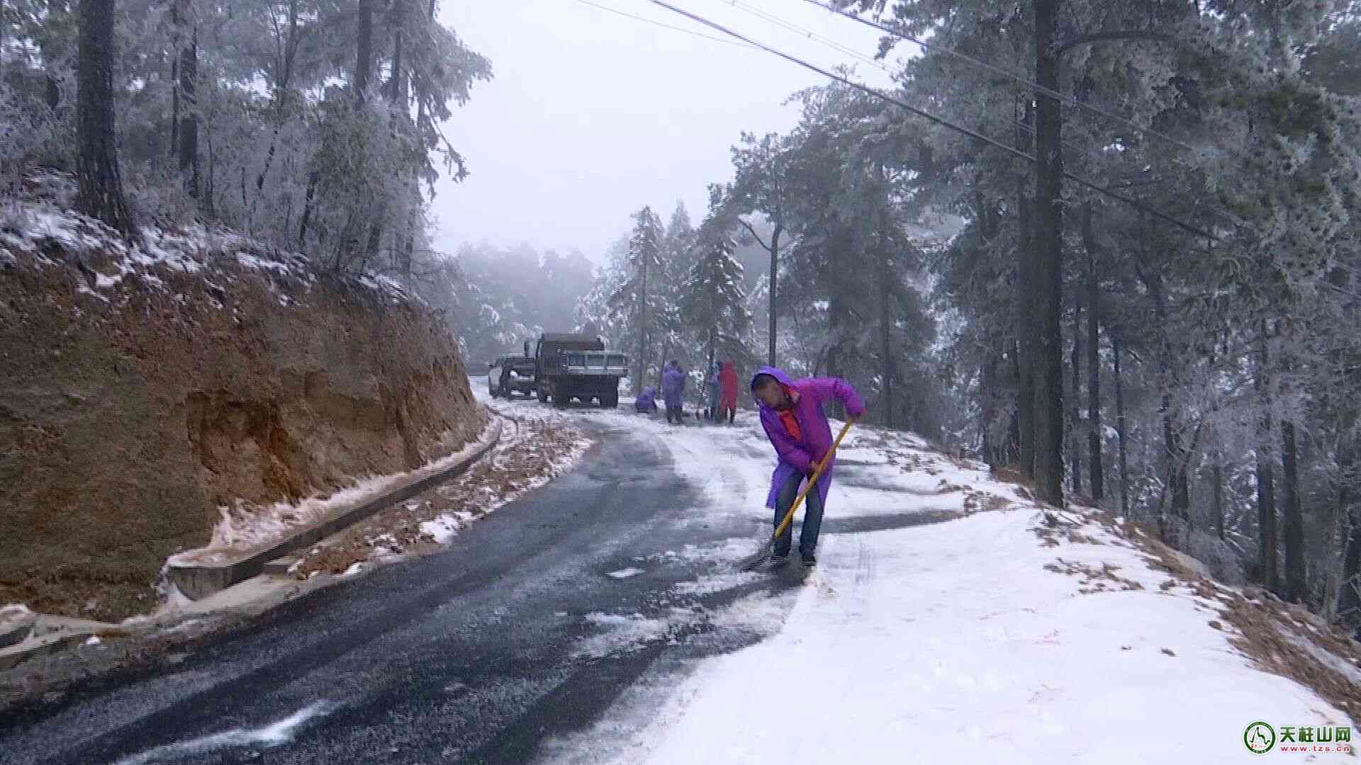 随即,天柱山管委会启动应急预案,对道路扫雪除冰工作进行安排部署。12月8日一早,天柱山管委会组织出动应急救援人员60余人,对重点路段抛撒了融雪剂,全面开展扫雪除冰工作,大家不畏严寒,挥舞着铁锹和扫帚,相互配合,你铲我扫。同时市地方公路局也组织人员全力配合应急救援人员的工作。