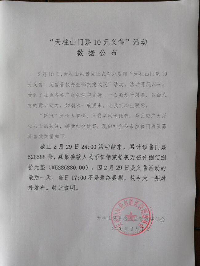 “天柱山门票10元义售”活动数据公布