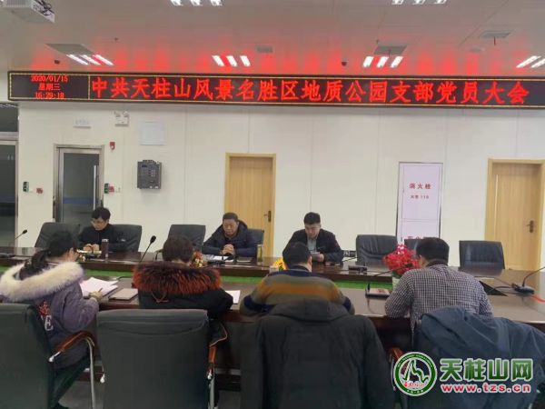 2020年1月15日,中共天柱山风景名胜区地质公园支部召开党员大会,支部全体党员参加会议,风景区党委委员、天管会副主任王晨东莅临会议指导。