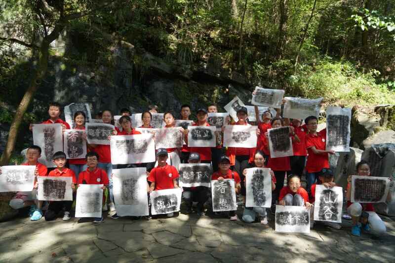 “穷幽深而不尽,坐石上以忘归”是北宋文学家王安石用以形容山谷流泉美景的经典诗句。在这里,营员们不仅体验到了青山绿水木桥溪流构成的静谧之美,还感受到了石刻上的文化与艺术:在长达1500余米的山谷两岸的石壁上,自唐代至今留存的名家文人石刻将近400方,琳琅满目,美不胜收。走在历代书法艺术长廊之中,仿佛再现了古代文人墨客徜徉于此,物我两忘,题辞勒石的场景……营员们还合作体验了拓片的制作,在锻炼动手能力的同时亲近了中国传统文化,感受了中国书法魅力。