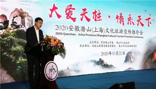 人民网上海10月21日电 今天上午,由中共潜山市委、潜山市人民政府主办的“大爱天柱 情系天下” 2020安徽潜山(上海)文化旅游宣传推介会在上海浦东新区举行。潜山市委书记张劲松、上海市文化和旅游局宣传推广处处长陈平致辞,市委副书记、市长梅耐雪推介潜山全域旅游,市委常委、天柱山风景区管委会副主任涂高生推介天柱山旅游,景域驴妈妈集团董事长、上海市安徽商会会长洪清华讲话。市领导黄银枝、郭玉晟、陈茜、余永灿、邵伟民、汪世平、林斗喜、蔡婷婷、程赟、赵伟出席推介会。