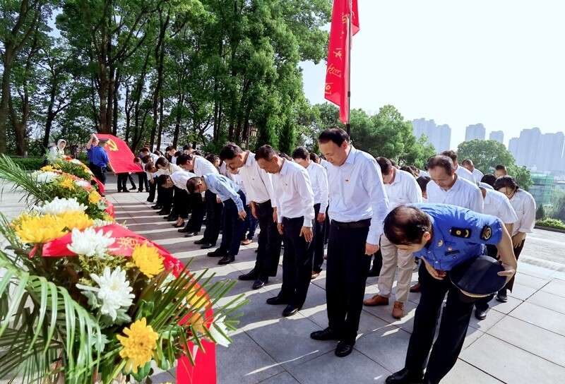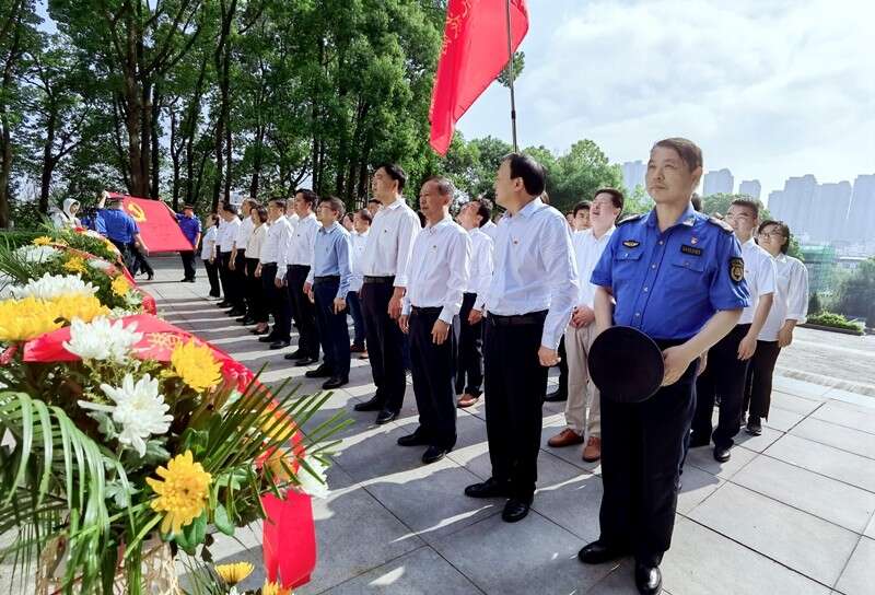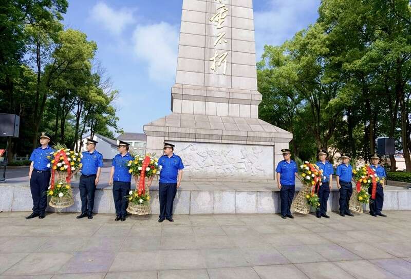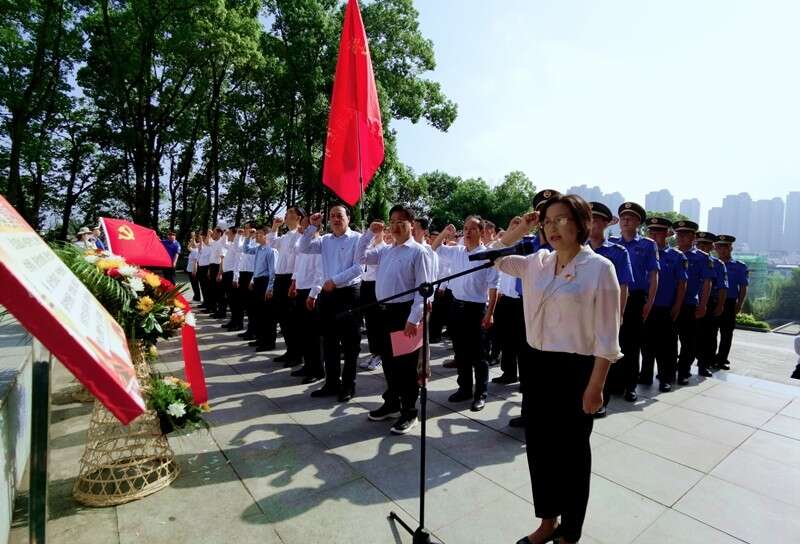 在革命烈士纪念碑前,党员们进行祭奠革命先烈扫墓仪式,由天柱山执法大队队员敬献花篮,市委常委、天柱山管委会副主任涂高生、天柱山管委会副主任余炳阳、市文化旅游体育局局长李桃生、天柱山旅游发展有限公司董事长汪全海整理挽联。天柱山风景区纪检监察工委书记江霞带领大家重温入党誓词,向烈士鞠躬致敬。