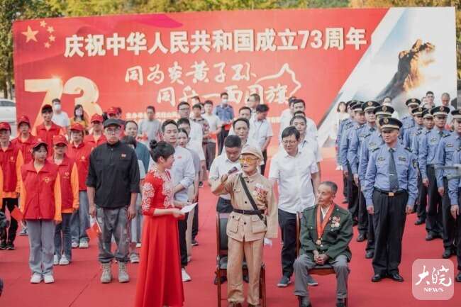 升旗仪式上,抗美援朝老兵面对“保家卫国 中国人民志愿军抗美援朝72周年”大型画板心情激动,现场重温了他们在战场上殊死战斗的不凡经历和感人故事。