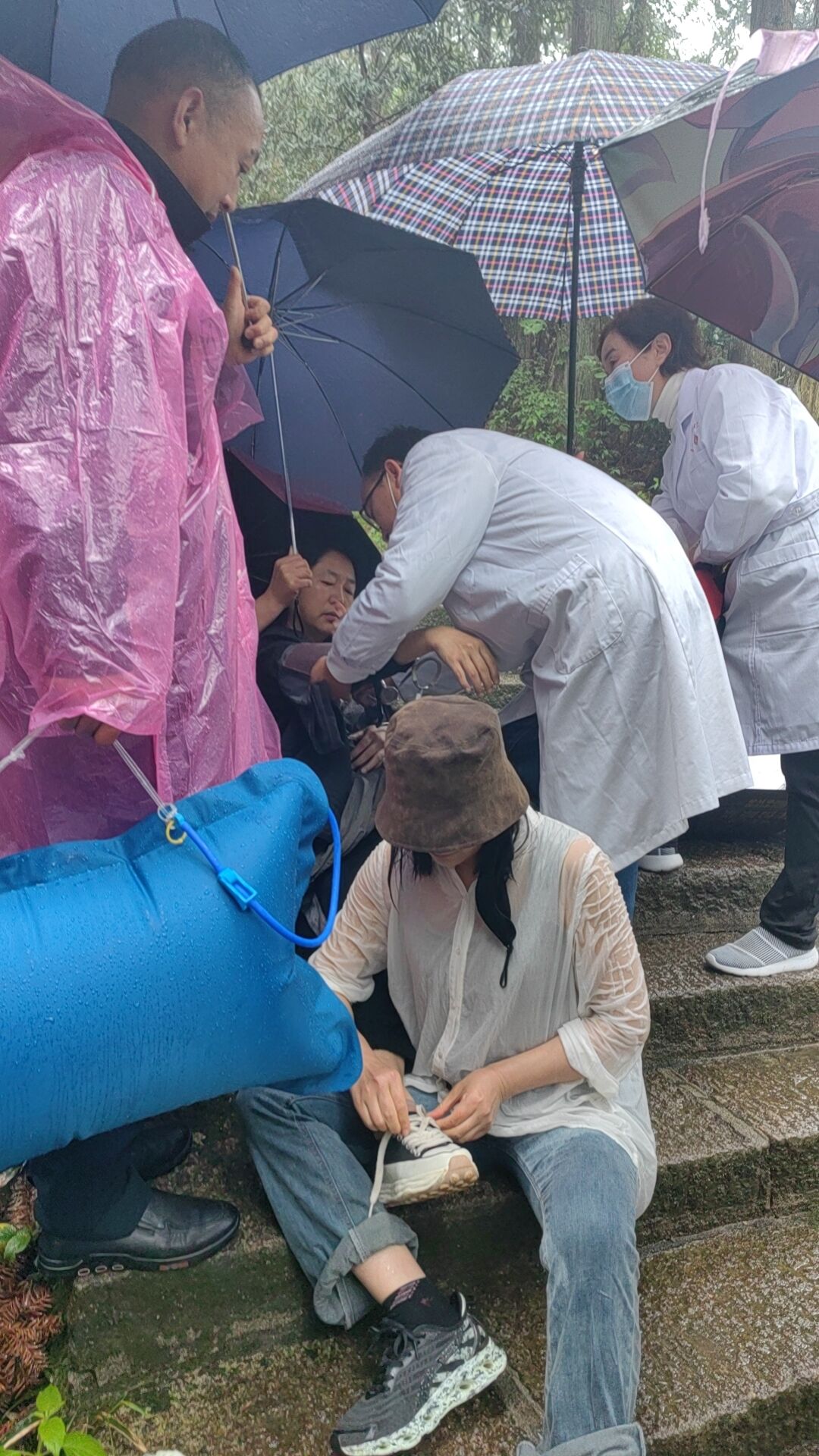 此时此刻,一场与时间赛跑的急速救援的暖心一幕,在天柱山景区真实上演。到达救援现场,游客高女士呈现心慌、四肢无力、全身发抖、不能言语、时有恶心等状态,医生给游客认真仔细地做了检查,表示情况十分危急,需及时到山下医院就诊。刘星第一时间拨通120急救电话,队员汪小曲冒雨把高女士从迎真峰背负至牧羊河索道上站,路程约四五百米,然后坐索道下山并将游客抬上救护车,送往潜山市中医院就诊,稍微歇停背负的汪小曲,已累得瘫软一旁,站立不稳。