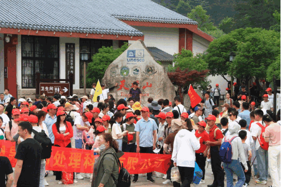 “中国旅游日”当天,天柱山风景区举办了“文明旅游、诗画天柱、幸福中国”—全国旅游直通车万人共攀天柱峰活动,迎来了来自省内外直通车共计百余辆。