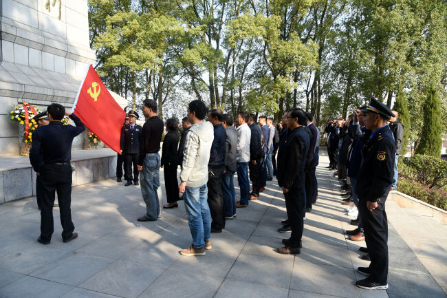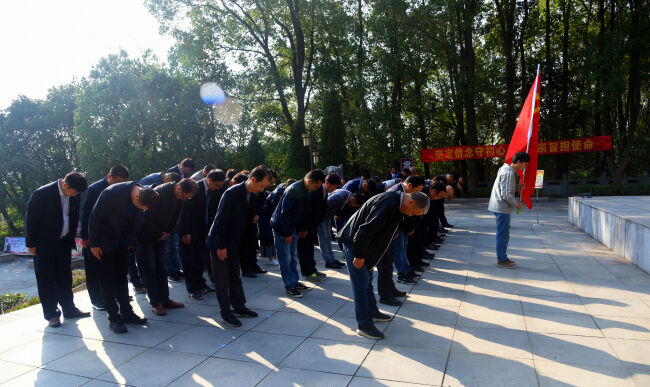 上午9时,全体人员整齐列队,缓步走进革命烈士陵园,向革命烈士纪念碑敬献花篮,在庄严肃穆的纪念碑前肃立默哀,并向烈士纪念碑三鞠躬。全体党员面向鲜红的党旗,庄严地举起右手进行入党宣誓,表达了不忘初心、牢记使命的政治信念,表达了为党的事业奋斗终身的决心和愿望。